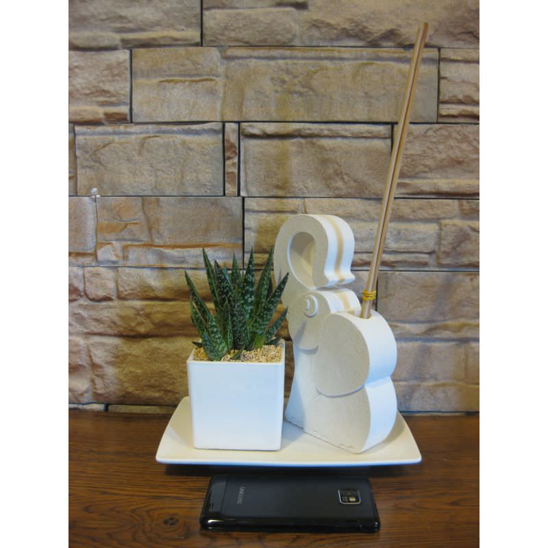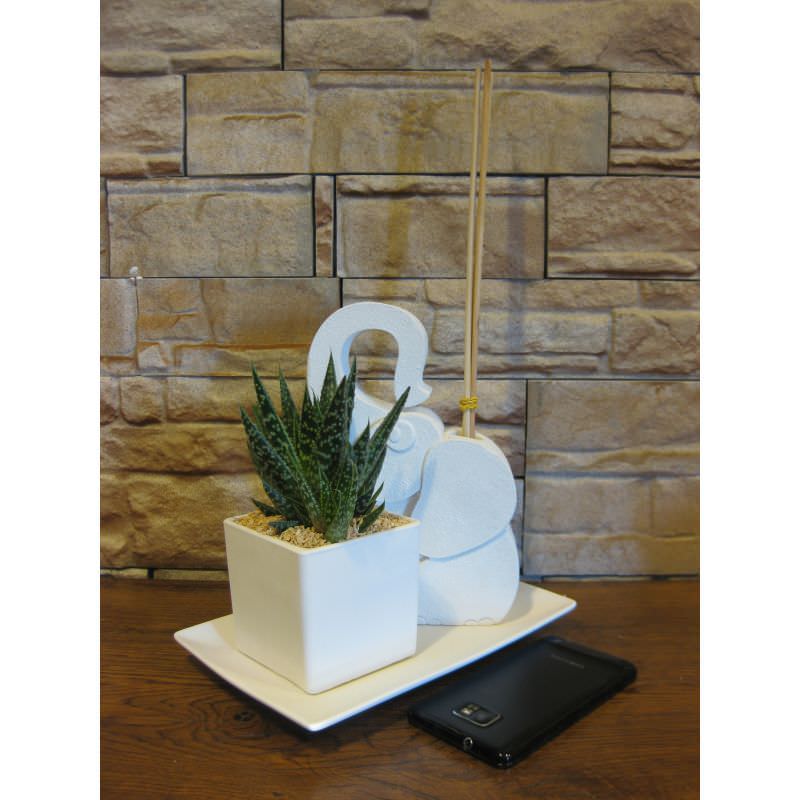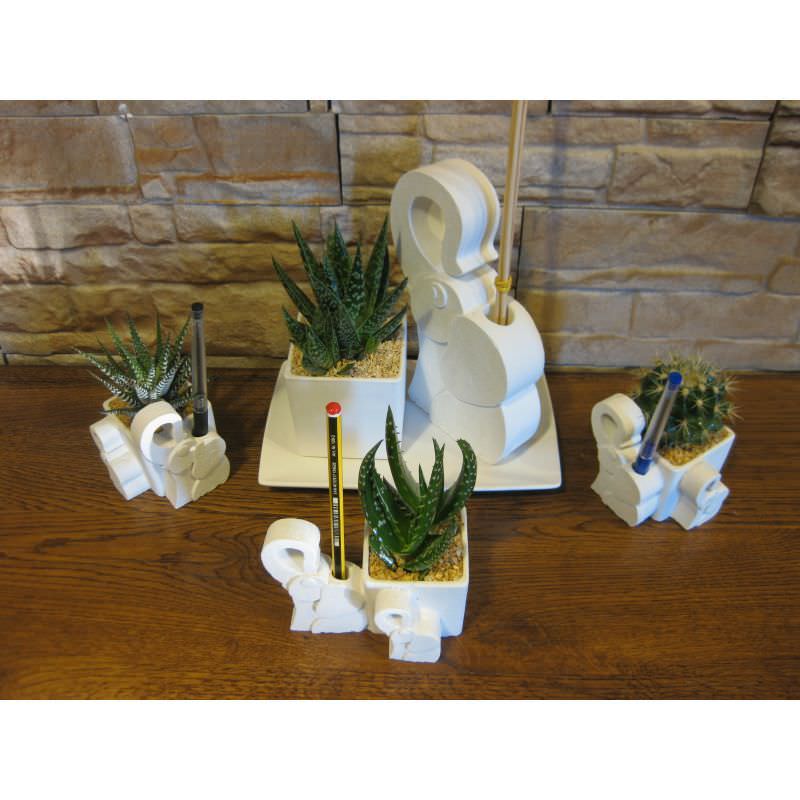 Serie da quattro elefanti porta penne con piante grasse di cui tre piccoli e uno grande.