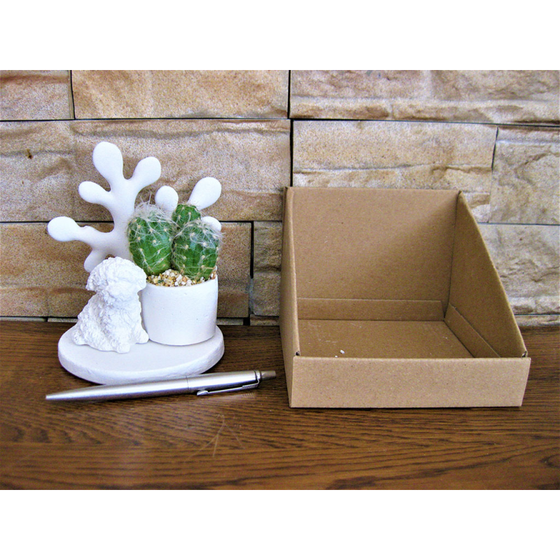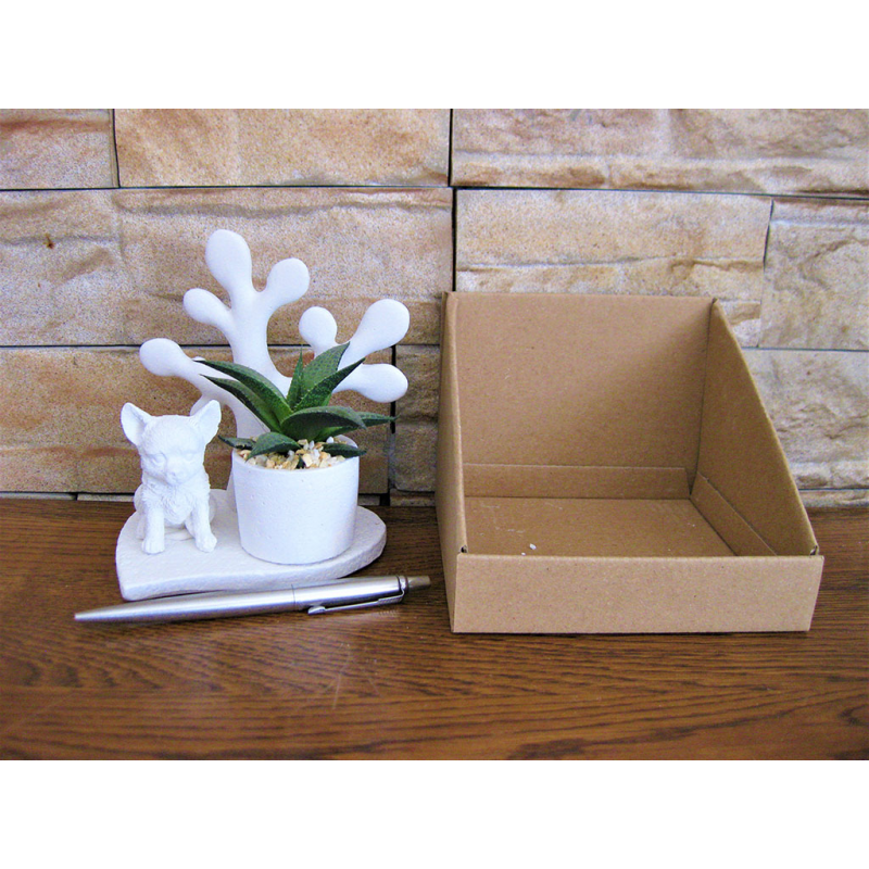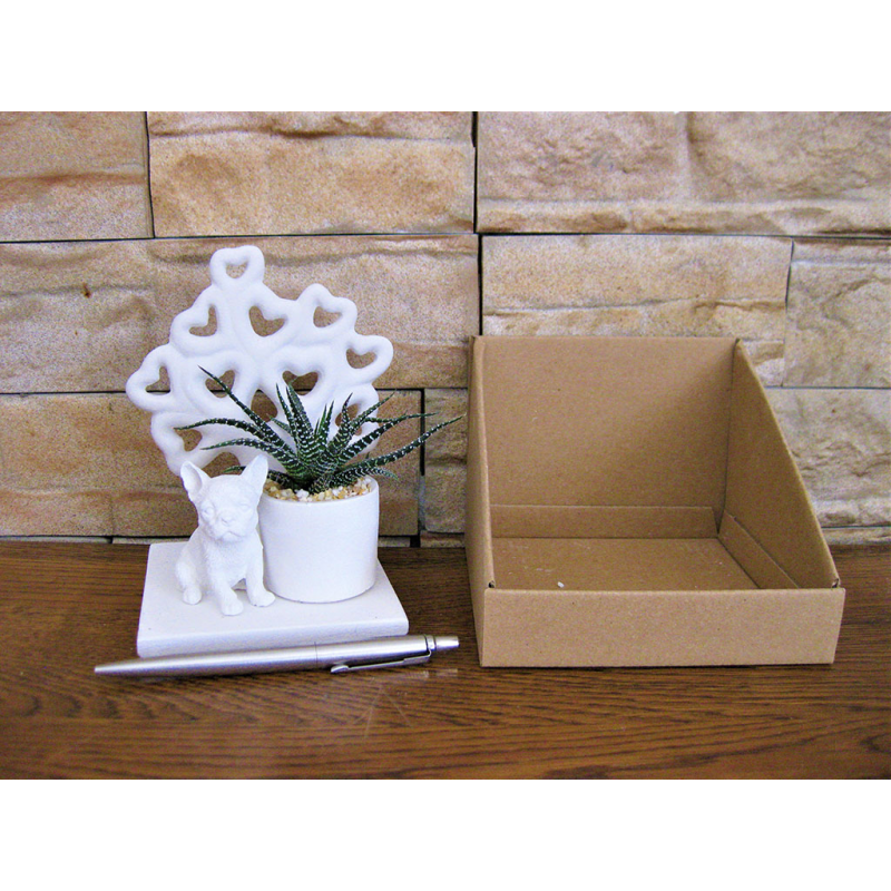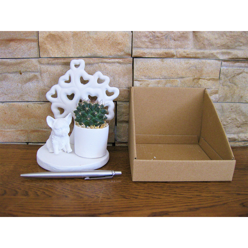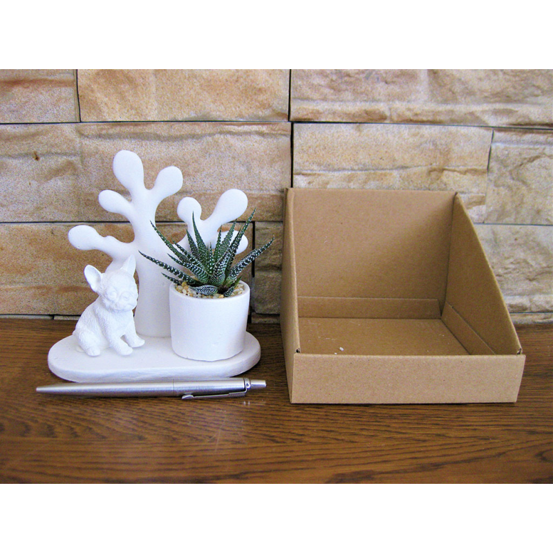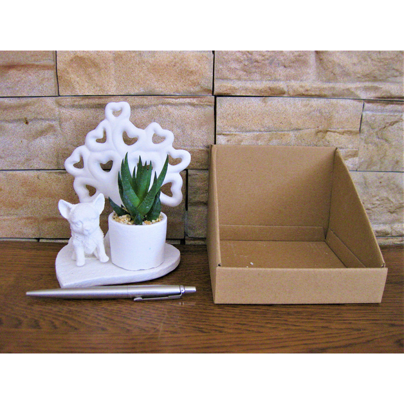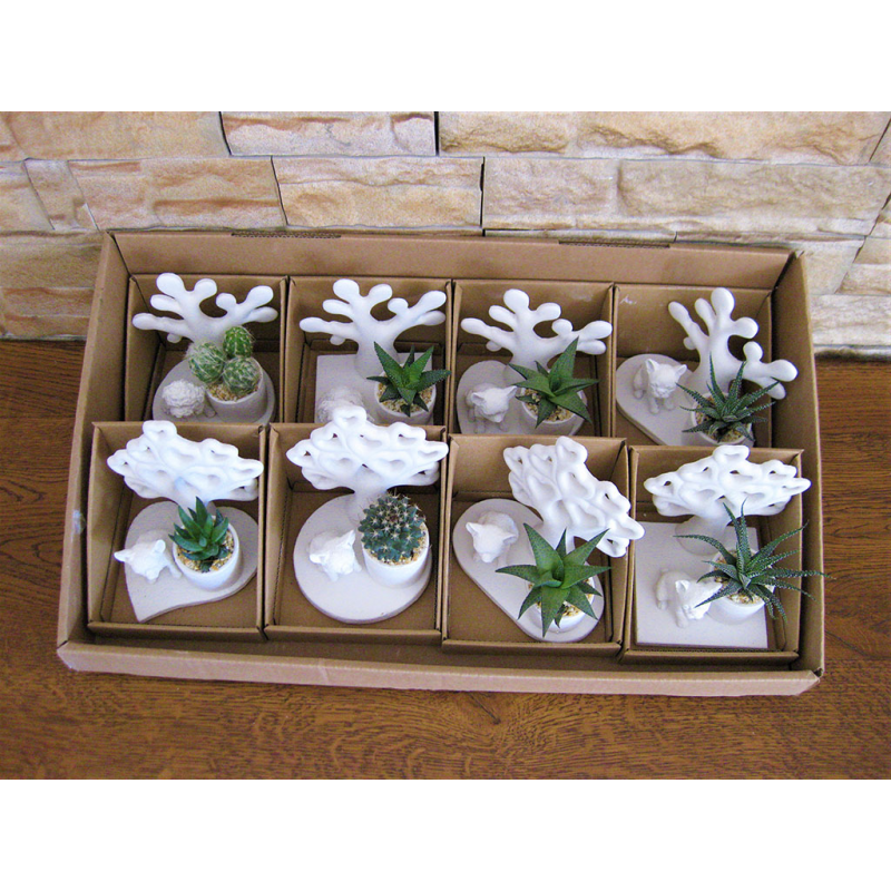 Cani piccoli su basi miste dentro scatolina con alberello della vita e piante grasse.