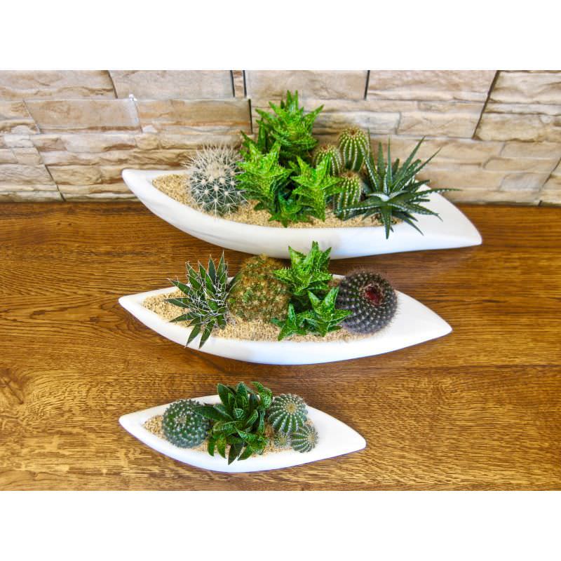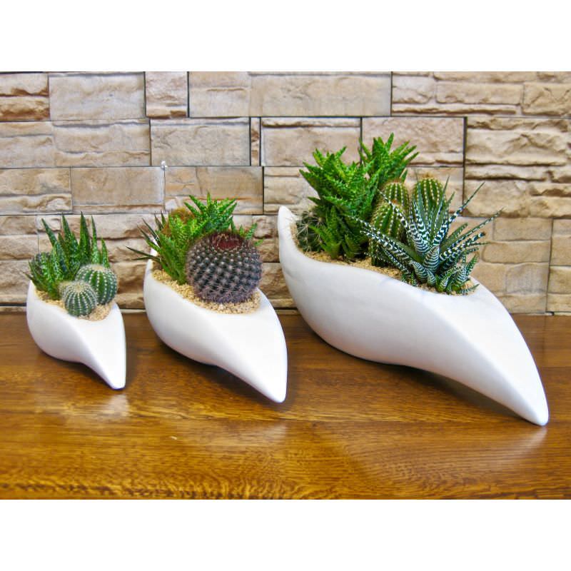 Serie in tris sculture in design moderno con composizione piante grasse.