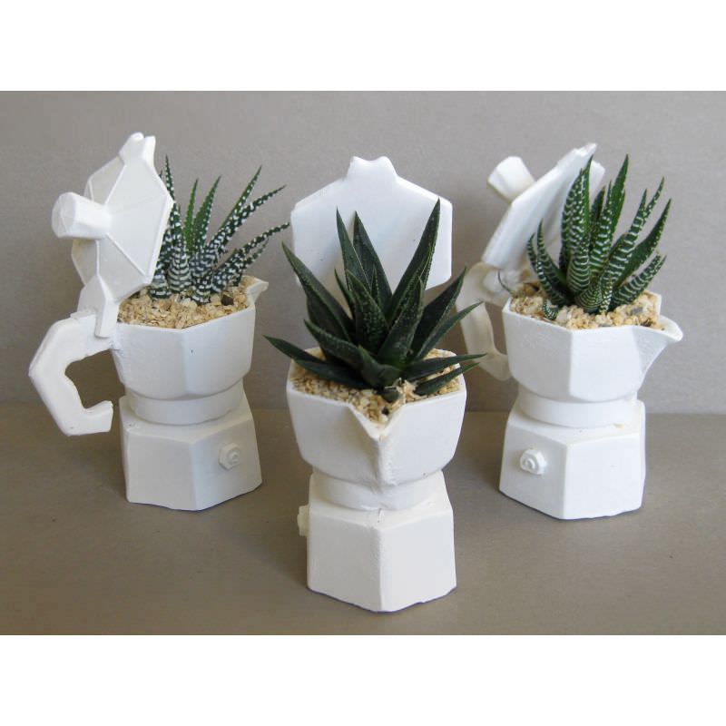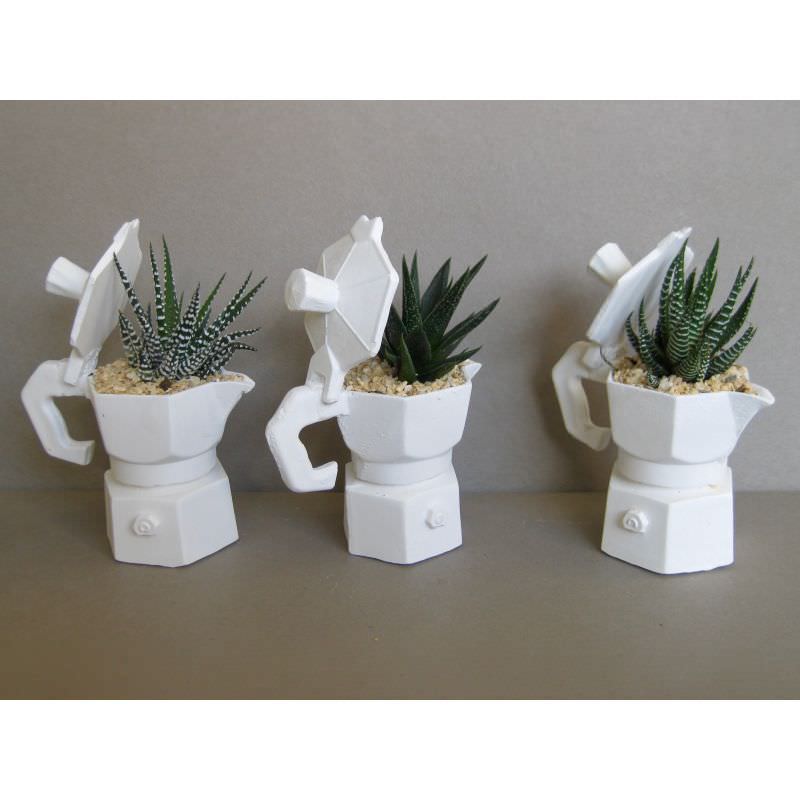 Moka o caffettiera piccola con all'interno una pianta grassa.