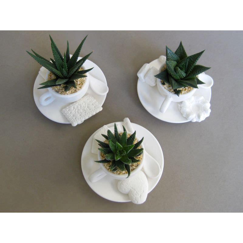 tazza mini con pianta grassa, piattino tondo e vassoio compreso