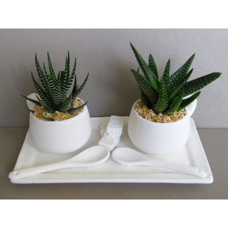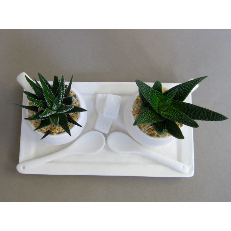 Vassoio rettangolare completo di 2 tazze da caffè con pianta grassa, 2 cucchiaini e zollette di zucchero.