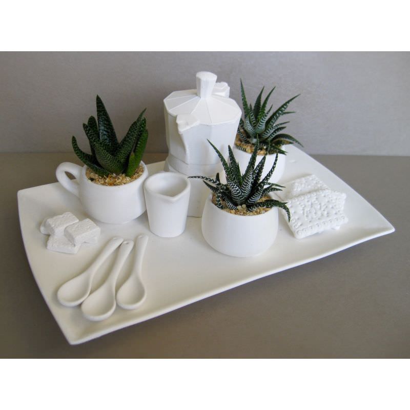 Servito su un grande vassoio rettangolare con tre tazze caffè, piante grasse, moka grande, porta latte, cucchiaini, biscotti misti e zollette di zucchero.