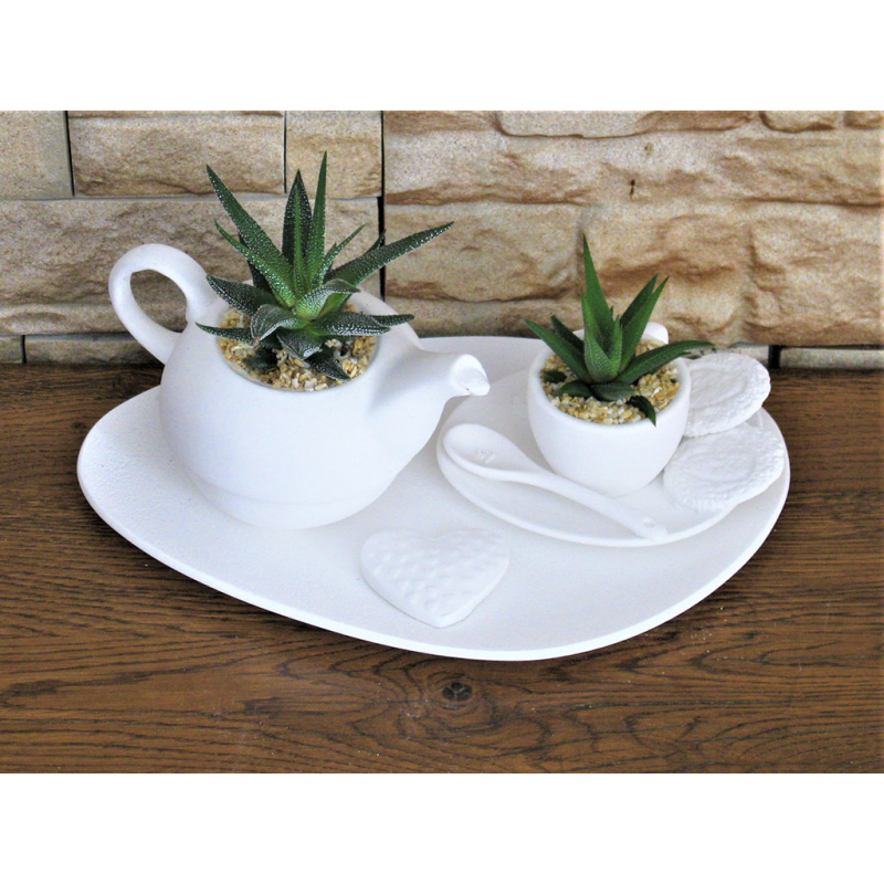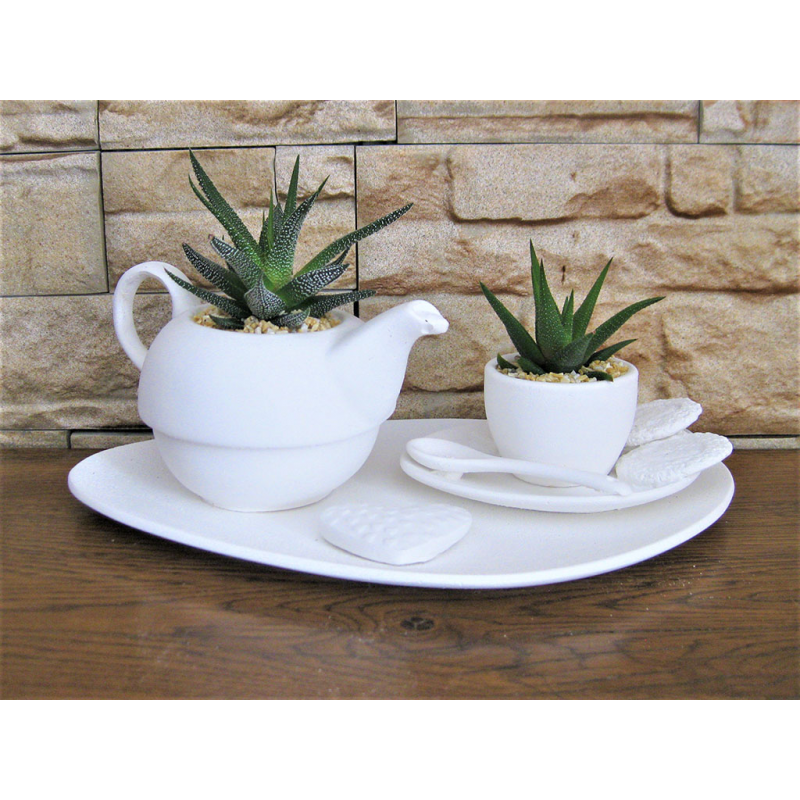 Vassoio teiera media con 1 tazza caffè con pianta grassa.