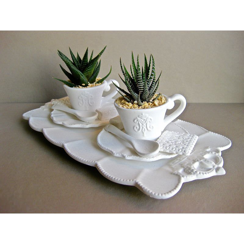 Serie completa tazze in stile shabby chic biscotti colorati e piante grasse.
