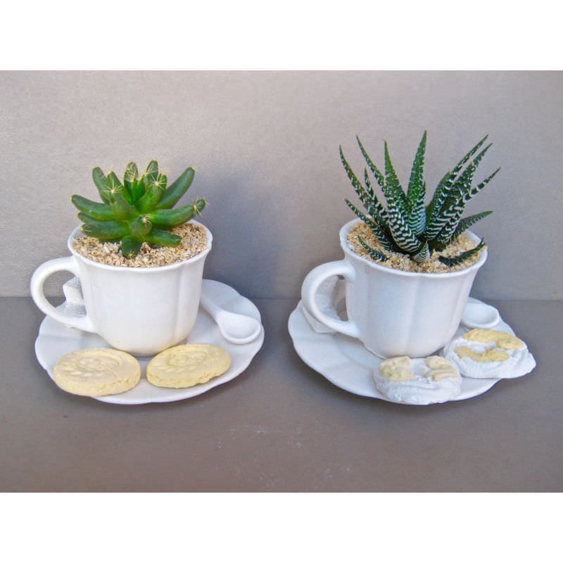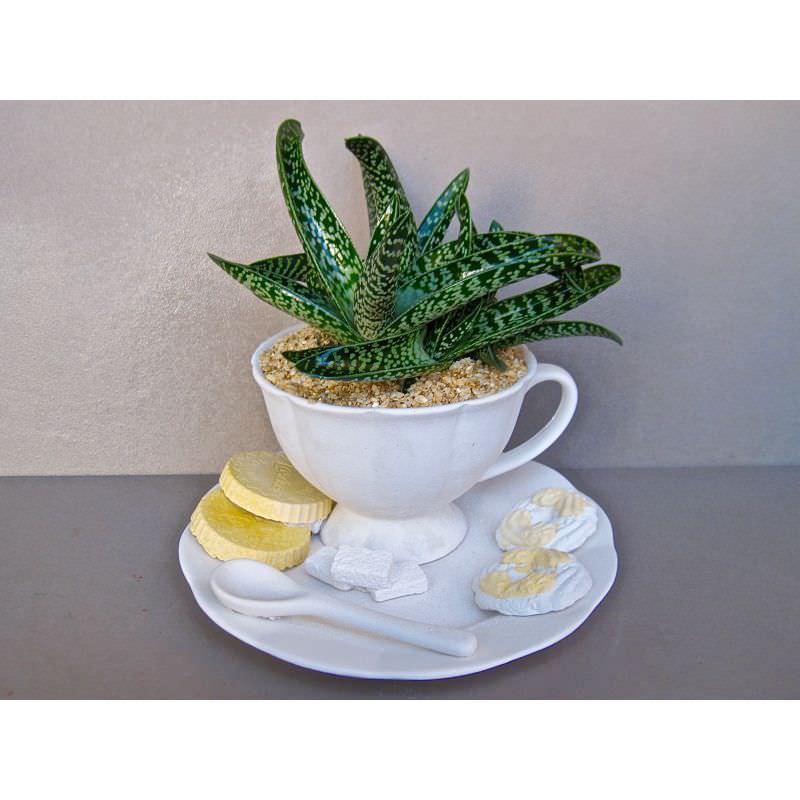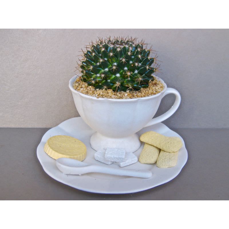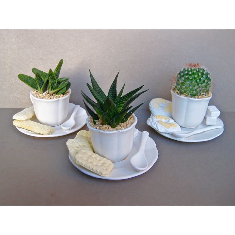 Ogni articolo è completo di pianta grassa, piattino, zollette di zucchero e biscotti misti colorati.