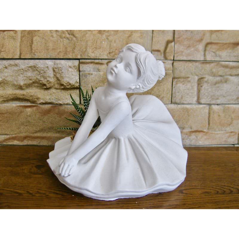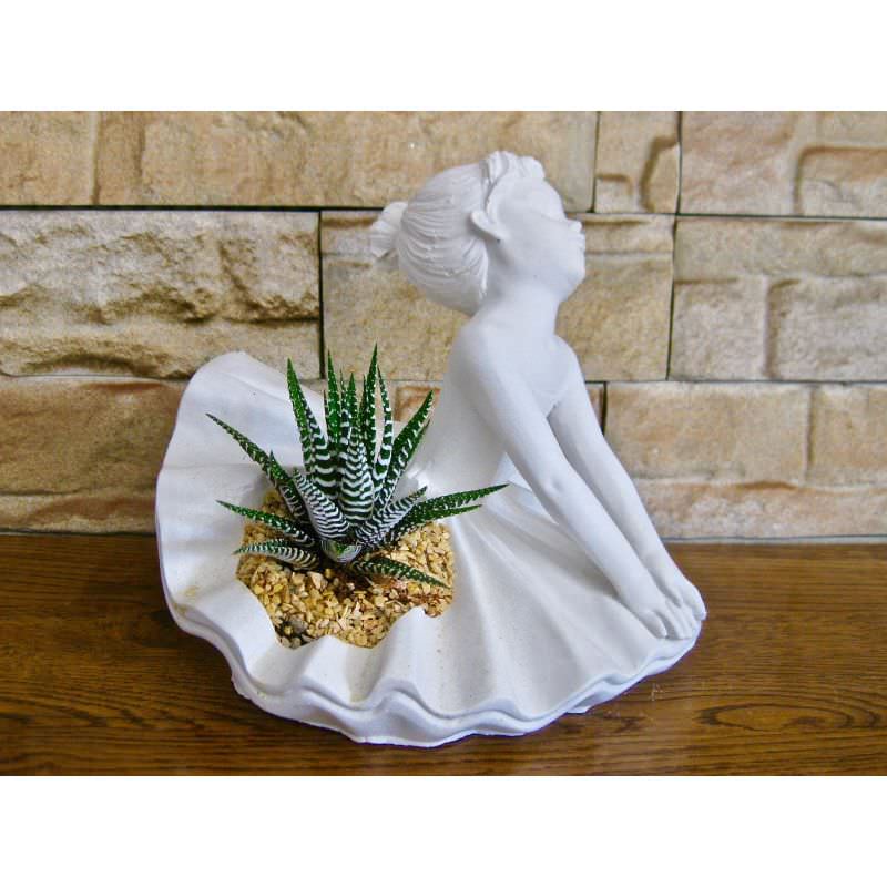 Scultura ballerina tonda seduta con pianta grassa.