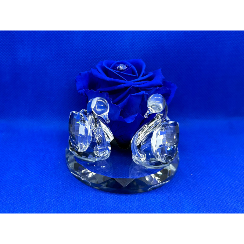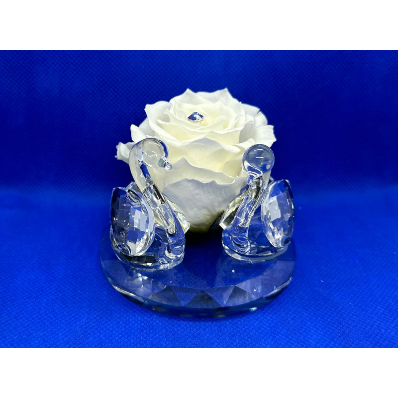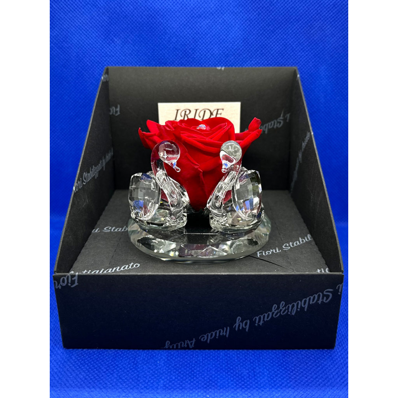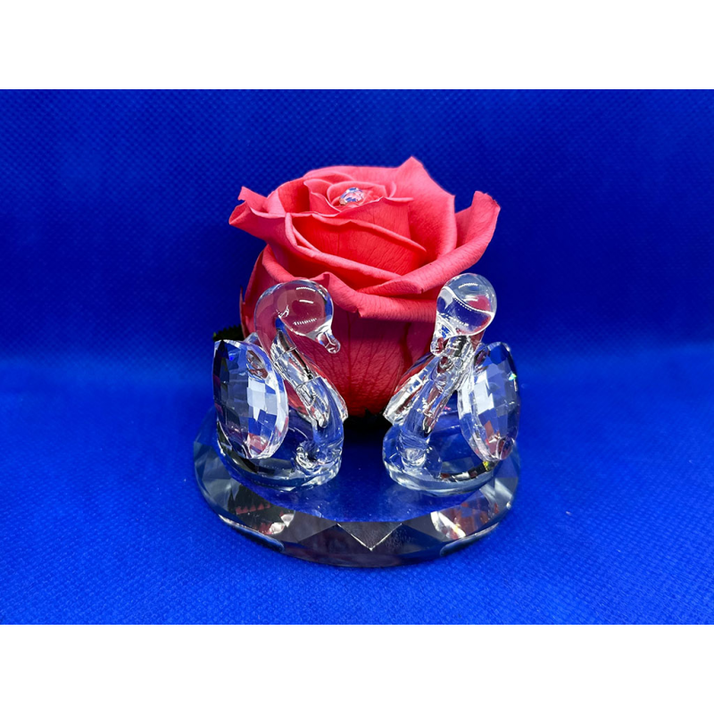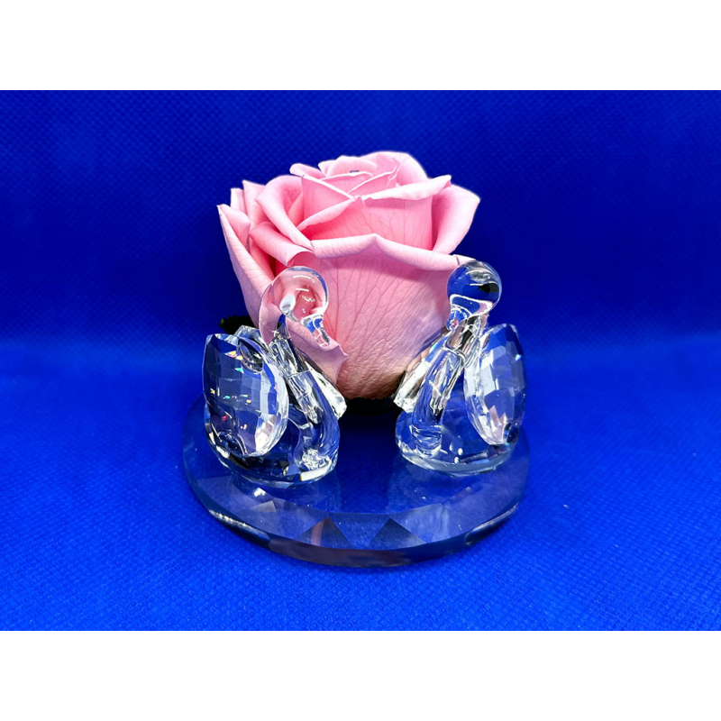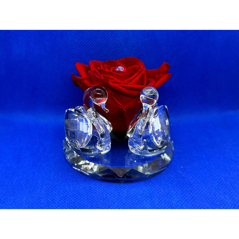 Cigni in cristallo con testa in vetro soffiato su base grande in cristallo e una rosa stabilizzata grande al centro.